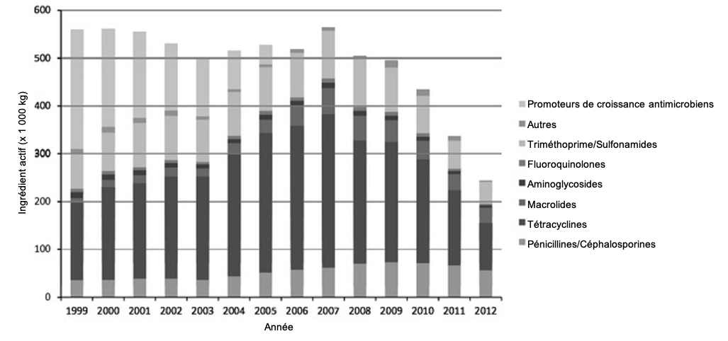 Grâce à la mise en œuvre de ce système et à d’autres mesures, les Pays-Bas ont réussi à réduire de 56 % l’utilisation d’antimicrobiens chez les animaux d’élevage entre 2007 et 20124. En outre, on a observé une importante diminution de l’utilisation d’antimicrobiens d’importance critique comme les céphalosporines de 3e et 4e génération et les fluoroquinolones. La figure ci-dessous illustre l’évolution de l’utilisation totale des antimicrobiens et des différentes classes d’antimicrobiens aux Pays-Bas entre 1999 et 2012.